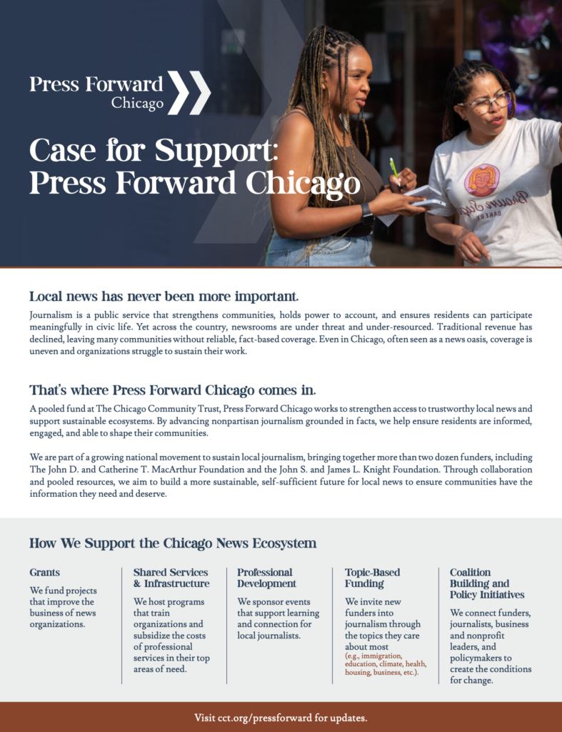 Press Forward Chicago, a pooled fund for journalism based at The Chicago Community Trust, seeks to create healthier communities through the support of strong and sustainable news and information ecosystems. Press Forward Chicago advances the public interest by strengthening access to trustworthy local information, supporting an informed community, and enhancing residents’ ability to participate meaningfully in civic and community decisions.