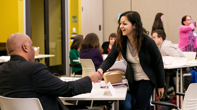 A standing woman smile sand shakes the hand of a man seated in a chair|A meeting room with people seated around shared tables.