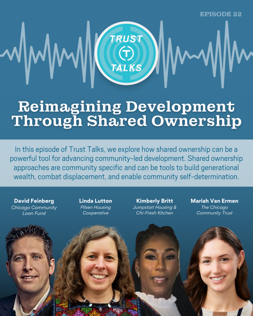 In this episode of Trust Talks, host Mariah Van Ermen, the Trust’s program manager for neighborhood impact and shared ownership, is joined by Linda Lutton, co-founder and project manager for expansion at Pilsen Housing Cooperative; Kimberly Britt, co-owner of Jumpstart Housing & Worker Cooperative and co-owner of ChiFresh Kitchen; and David Feinberg, director of coaching and knowledge transfer at Chicago Community Loan Fund. Together, they explore how shared ownership can be a powerful tool for advancing community-led development. Shared ownership approaches are community-specific and can be tools to build generational wealth, combat displacement, and enable community self-determination. They also share resources and funding strategies to help others explore shared ownership in their own communities.